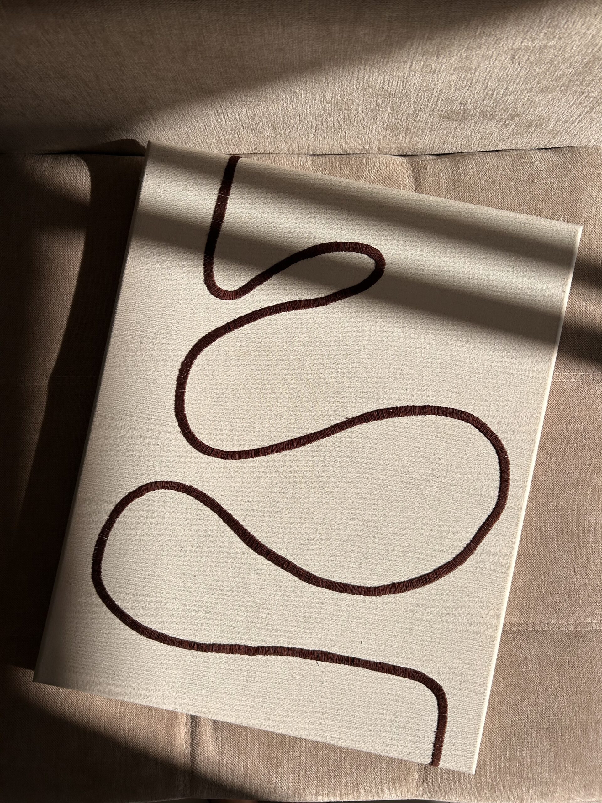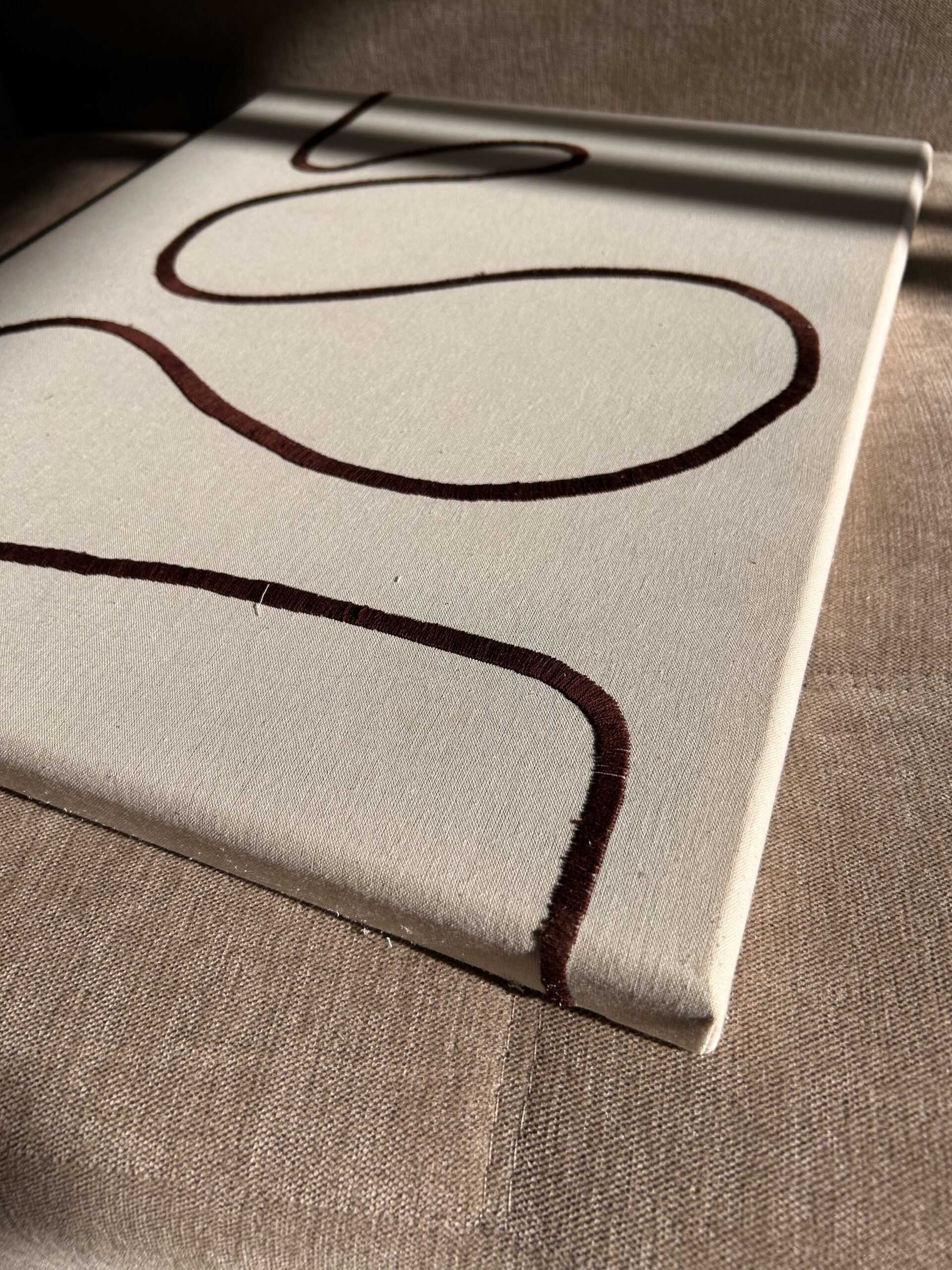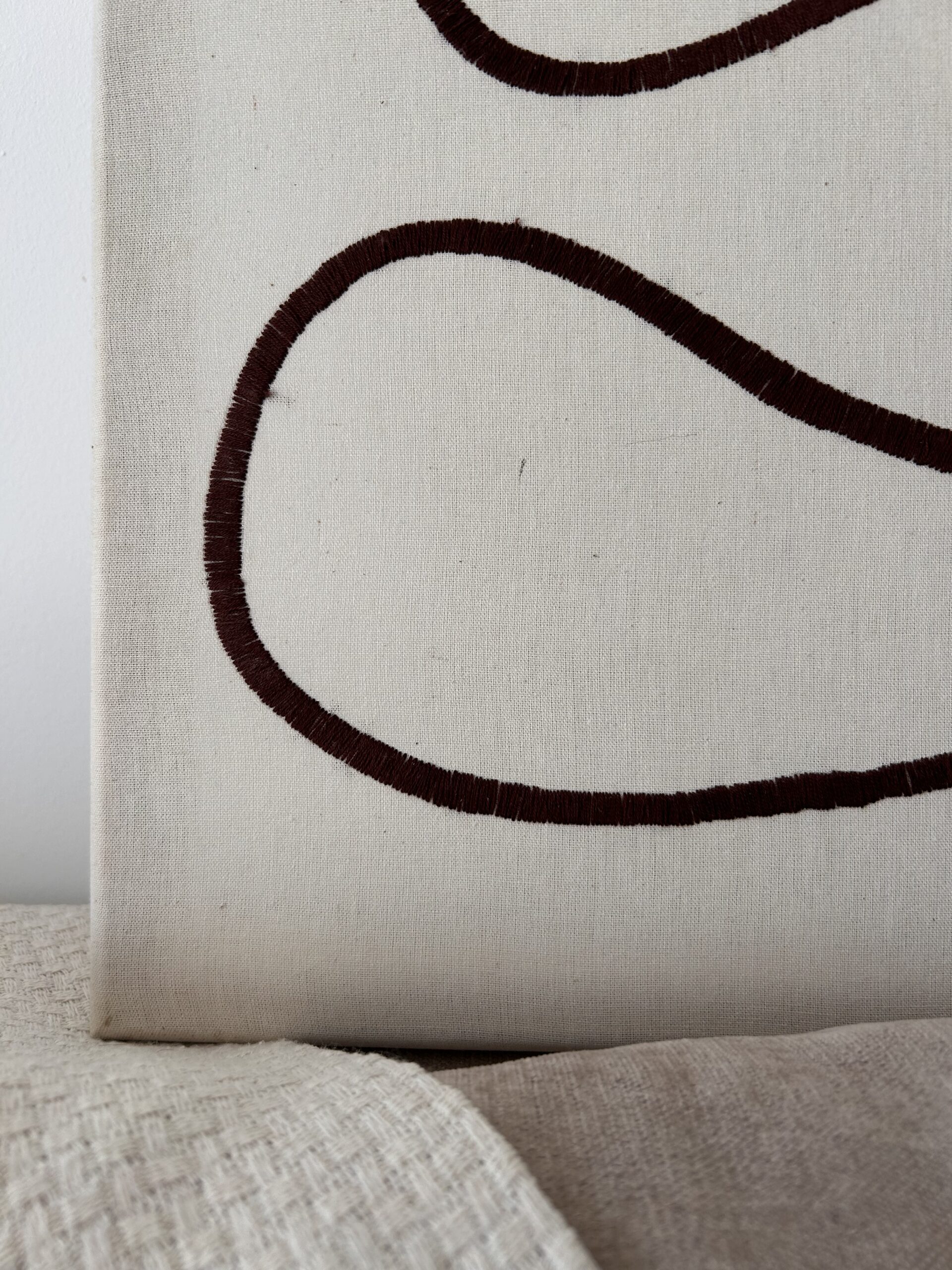 Bordado a mano sobre lienzo con diseño abstracto de líneas orgánicas en contraste. Textura sutil que aporta relieve y movimiento.